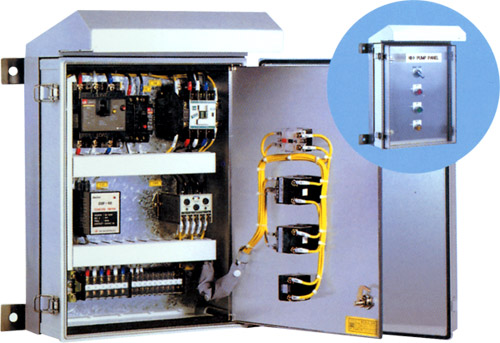 P.C 재질의 ENCLOSURE와 SHADE에 STS의 FLAME을 BOLTING 조립한 것으로써 PUMP의 조작 SEQ'를 내장하여 PUMP CONTROL을 표준화하였습니다.