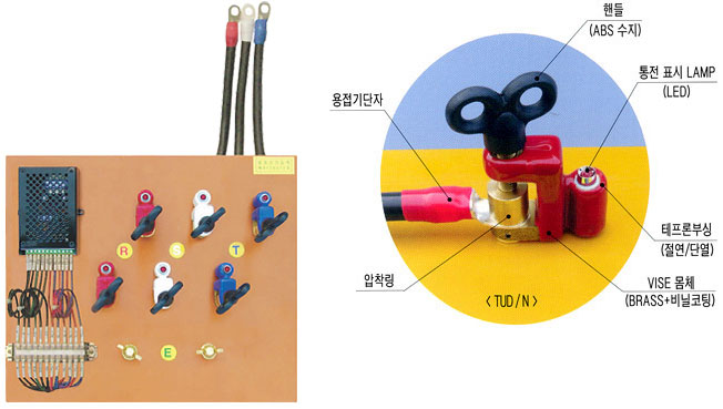 - ABS 사출로 성형된 핸들을 돌려 단자를 체결 또는 해체하므로 감전 위험이 없음